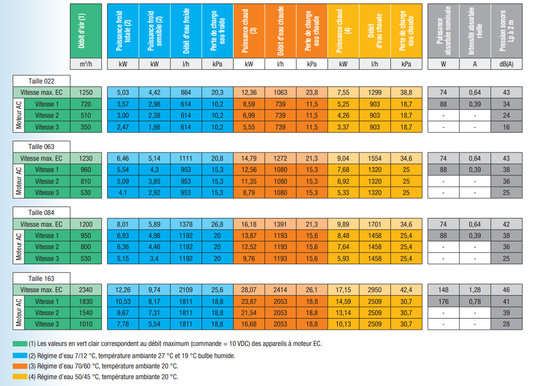 Caractéristiques techniques pour cassette plafonnière à eau 12,56 kW moteur AC AquaVent VCC063 - AXELAIR